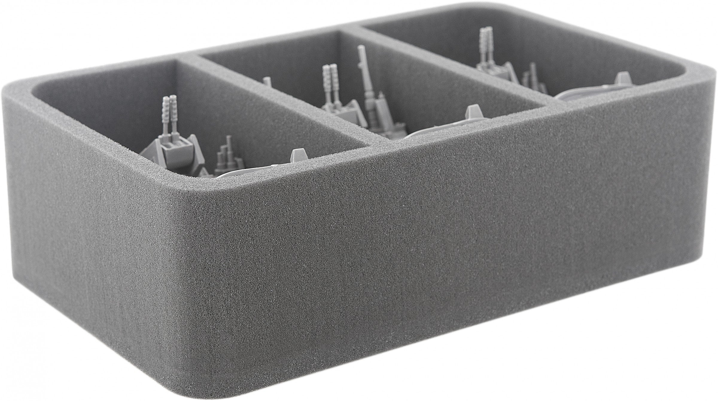 Cet insert en mousse possède 3 grands compartiments avec 2 formes de base différentes (deux compartiments ont des coins arrondis). Avec cette forme, les tapis s'intègrent parfaitement dans nos étuis FELDHERR. Les grands compartiments offrent suffisamment de place pour les assiettes de jeu Star Wars Imperial Assault AT-ST et AT-ST Genaeral Weiss Expansion Pack.