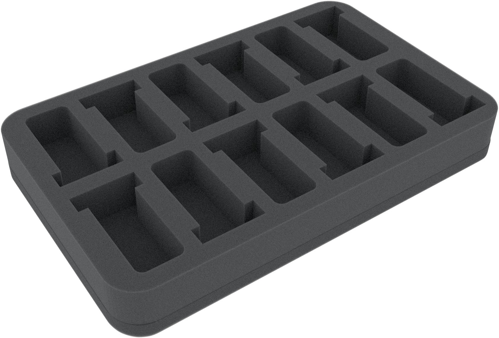 Foam Tray for small miniatures on 25 mm bases. The 35 mm depth of the foam is result from 10 mm foam base and slot foam tray with 25 mm effective depth. The half-size foam tray fits into our Feldherr bags, hard cases, backpacks and storage boxes.