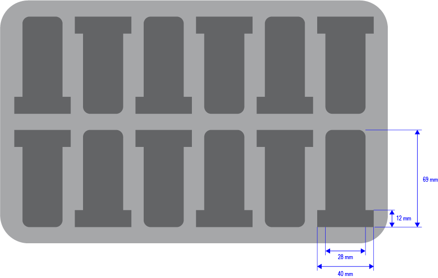 - 12 slots: 40/28 mm x 69 mm x 25 mm