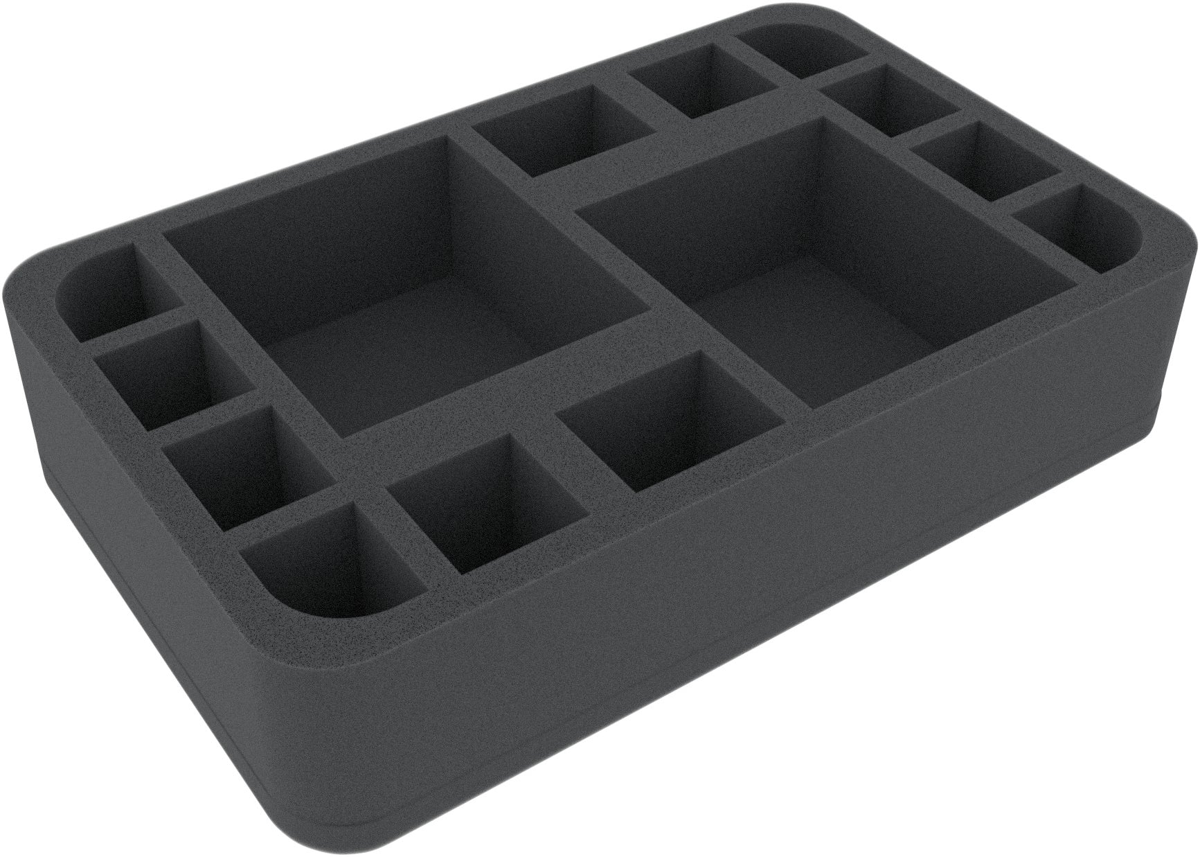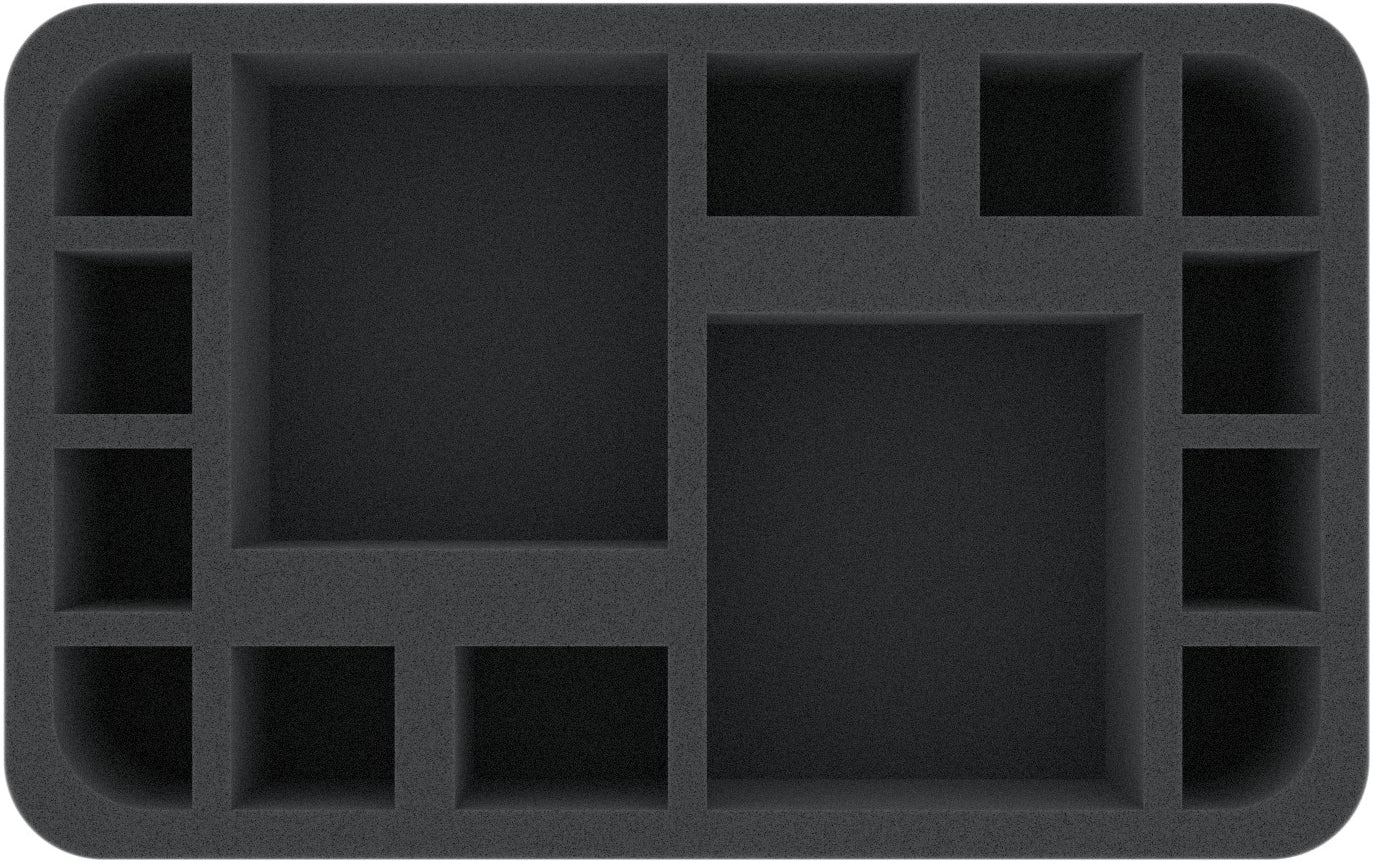 This Half-Size foam tray is divided into 14 compartments of different sizes. It is particularly suitable for the safe storage of small to medium-sized figures for various board games and tabletop systems. Game material or other small parts can also be neatly stowed here.