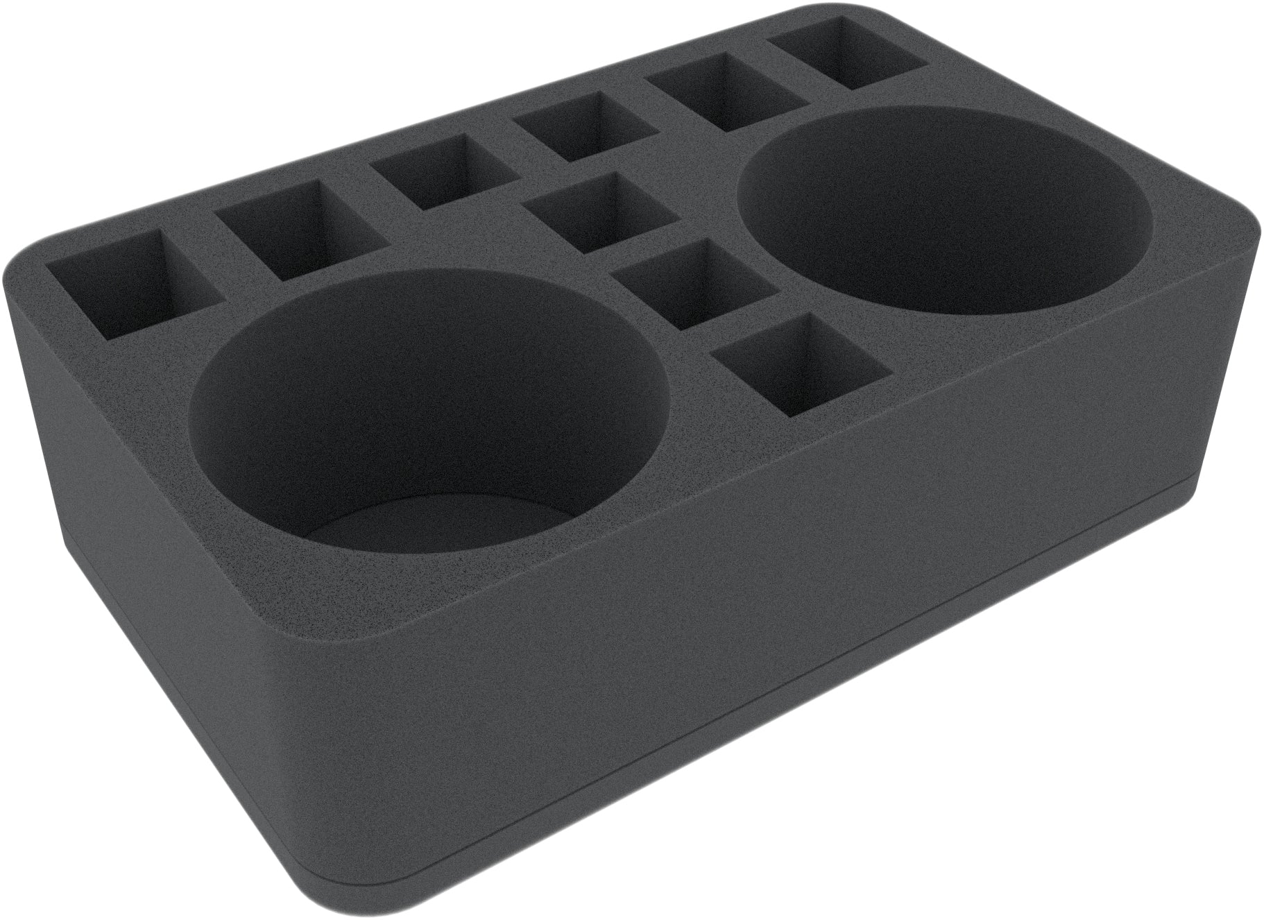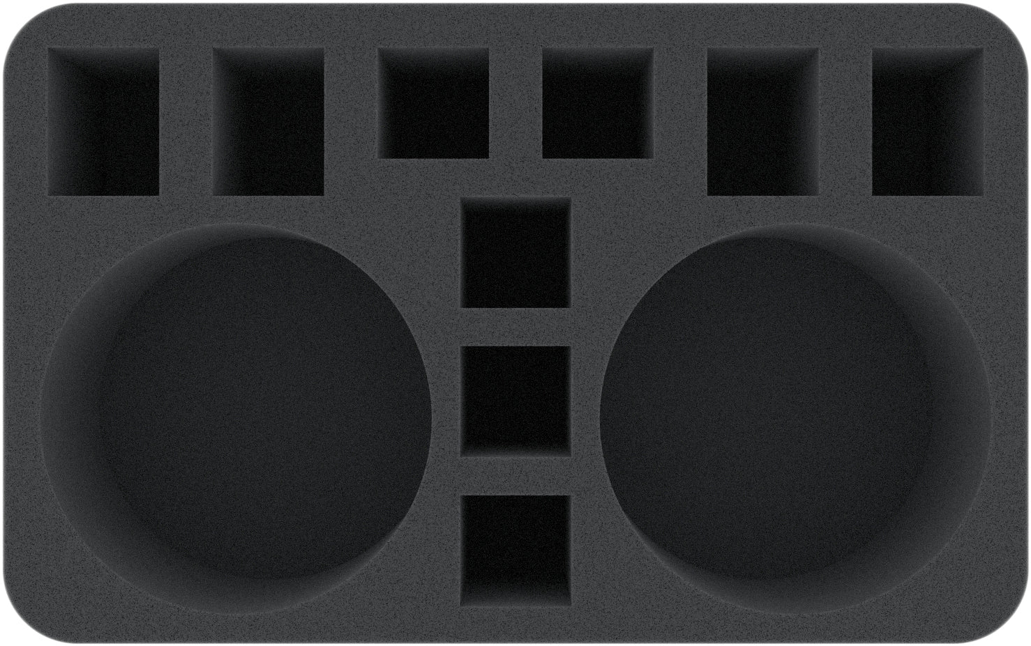 This Half-Size foam tray has 2 large round and 9 rectangular compartments. It is therefore well suited for mixed miniature sets - two compartments for miniatures with large round base up to 105 mm diameter and 9 for smaller figures.