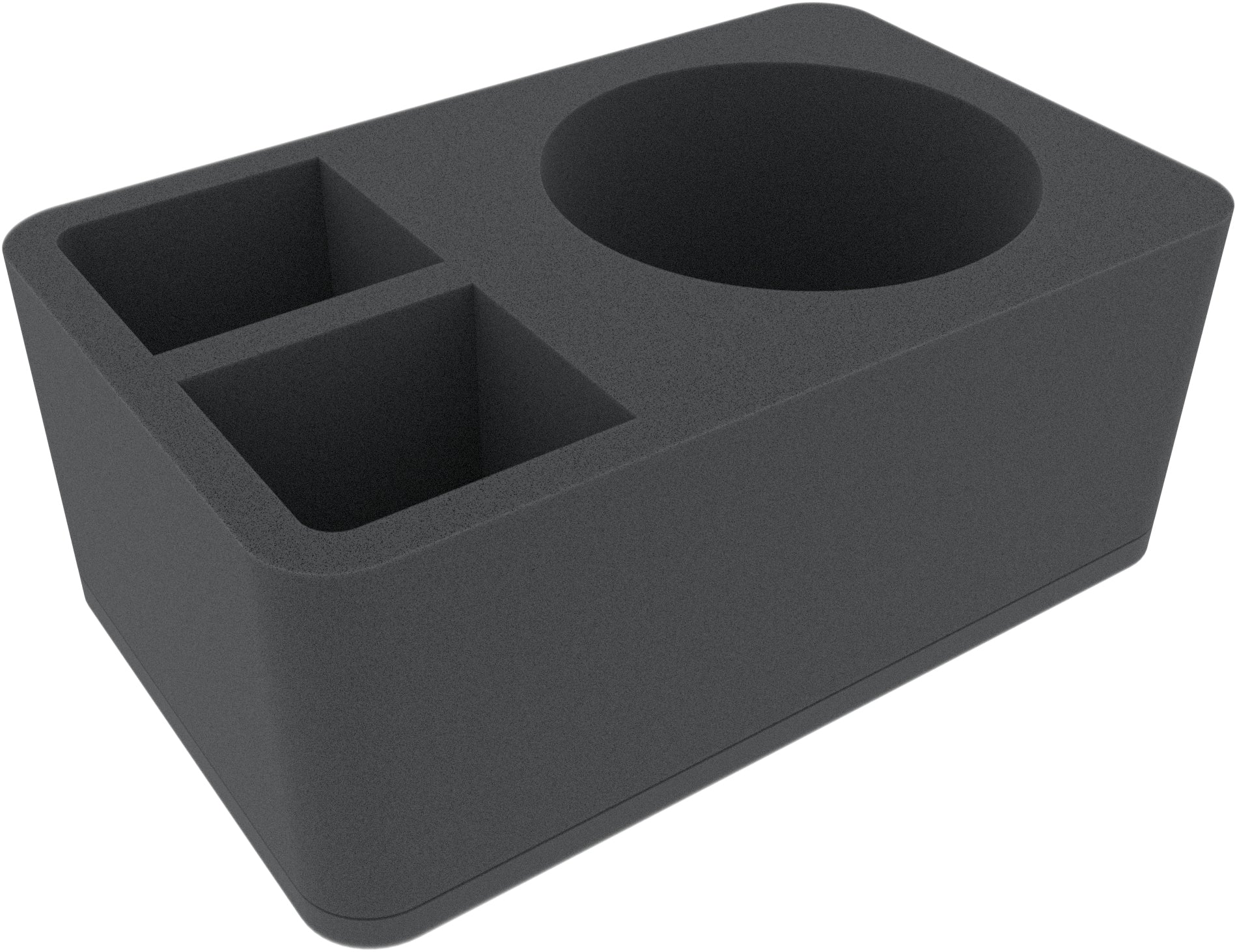 This half-size foam tray has 3 compartments of different sizes, one large round compartment and two rectangular compartments. It is particularly suitable to safely store larger miniatures for various board games and tabletop systems. Game material or other small parts can also be neatly stowed here.