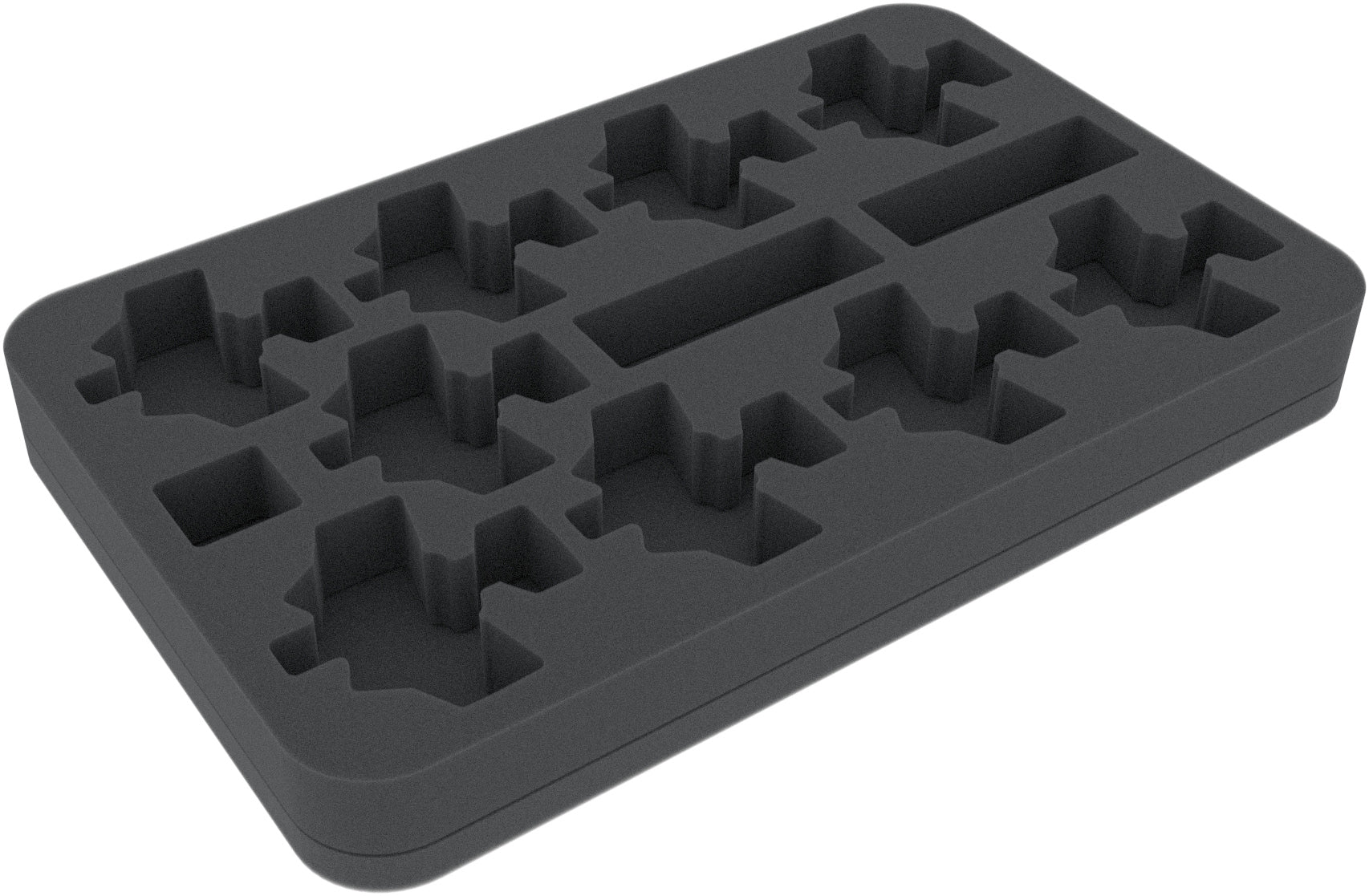 The Half-Size foam tray has the dimensions: 275 mm x 172 mm x 30 mm total height (20 mm usable height + 10 mm foam base).