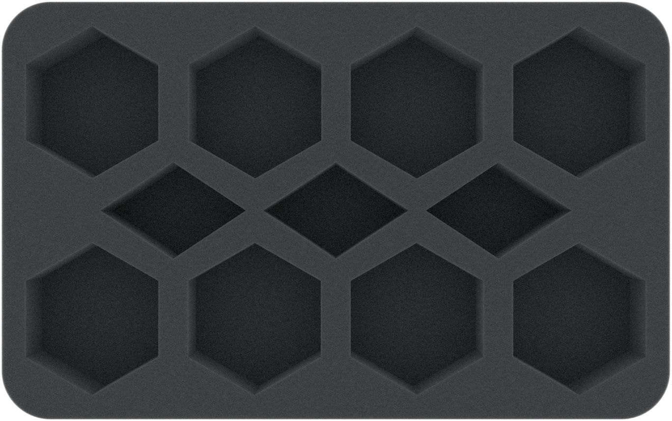 This Half-Size foam tray is divided into 11 compartments with 2 different sizes. The hexagonal compartments are particularly suitable for neat storage of tiles and bases (e.g. Aeronautica Imperialis). The three small compartments in the middle can be used for tokens and other accessories.