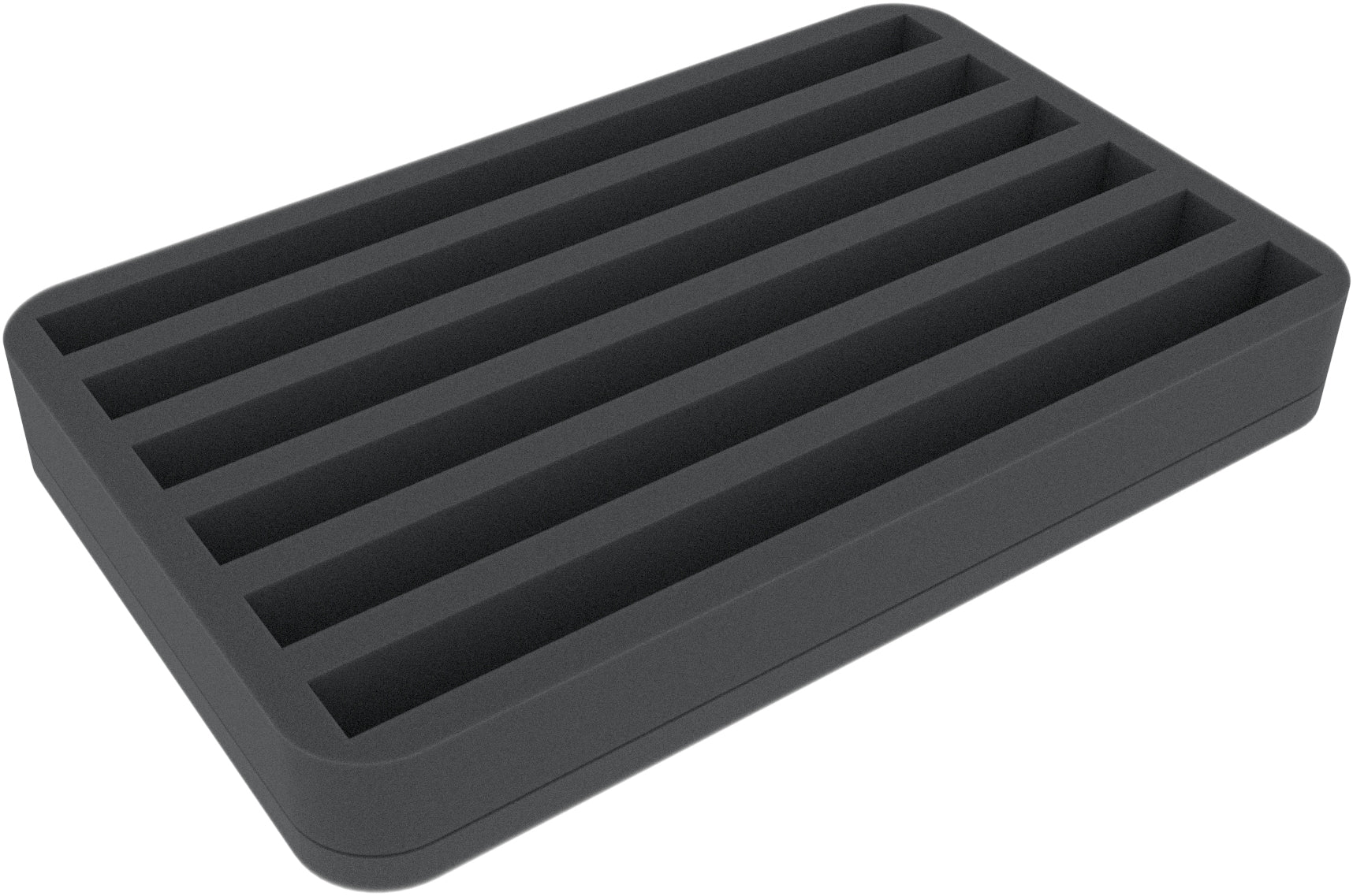 This Half-Size foam tray is divided into 6 elongated compartments of equal size. It is particularly suitable for the safe storage of tabletop and board game miniatures and other sensitive models (e.g. model railways) and small parts.