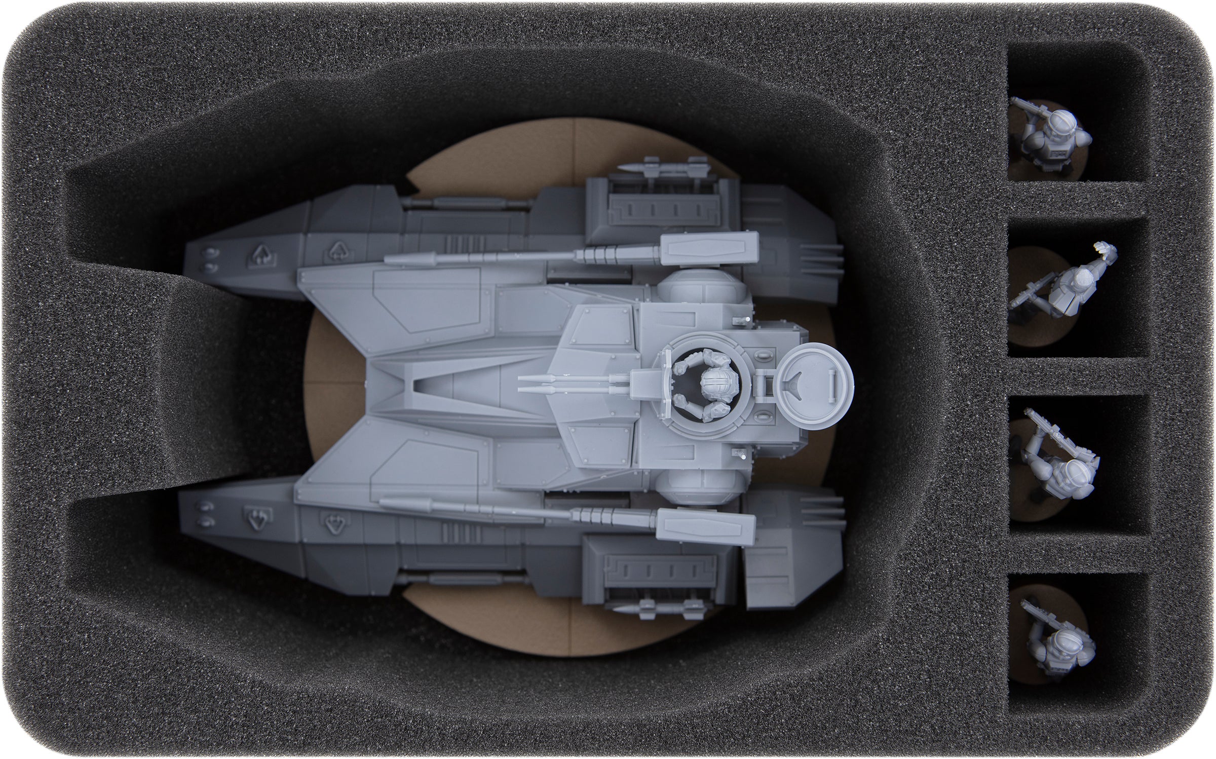The large compartment is custom-tailored to fit one model of the TX-130 including base. Thanks to the precisely fitting cut, the miniature stays safely in place even during transport. The soft foam protects the weapons, antennas and turret gunner from damage. The colors of the painted miniature are reliably protected from scratches and abrasion as well