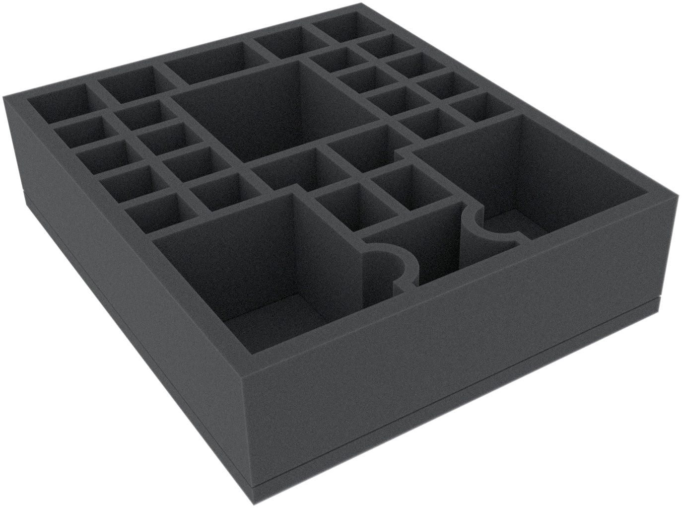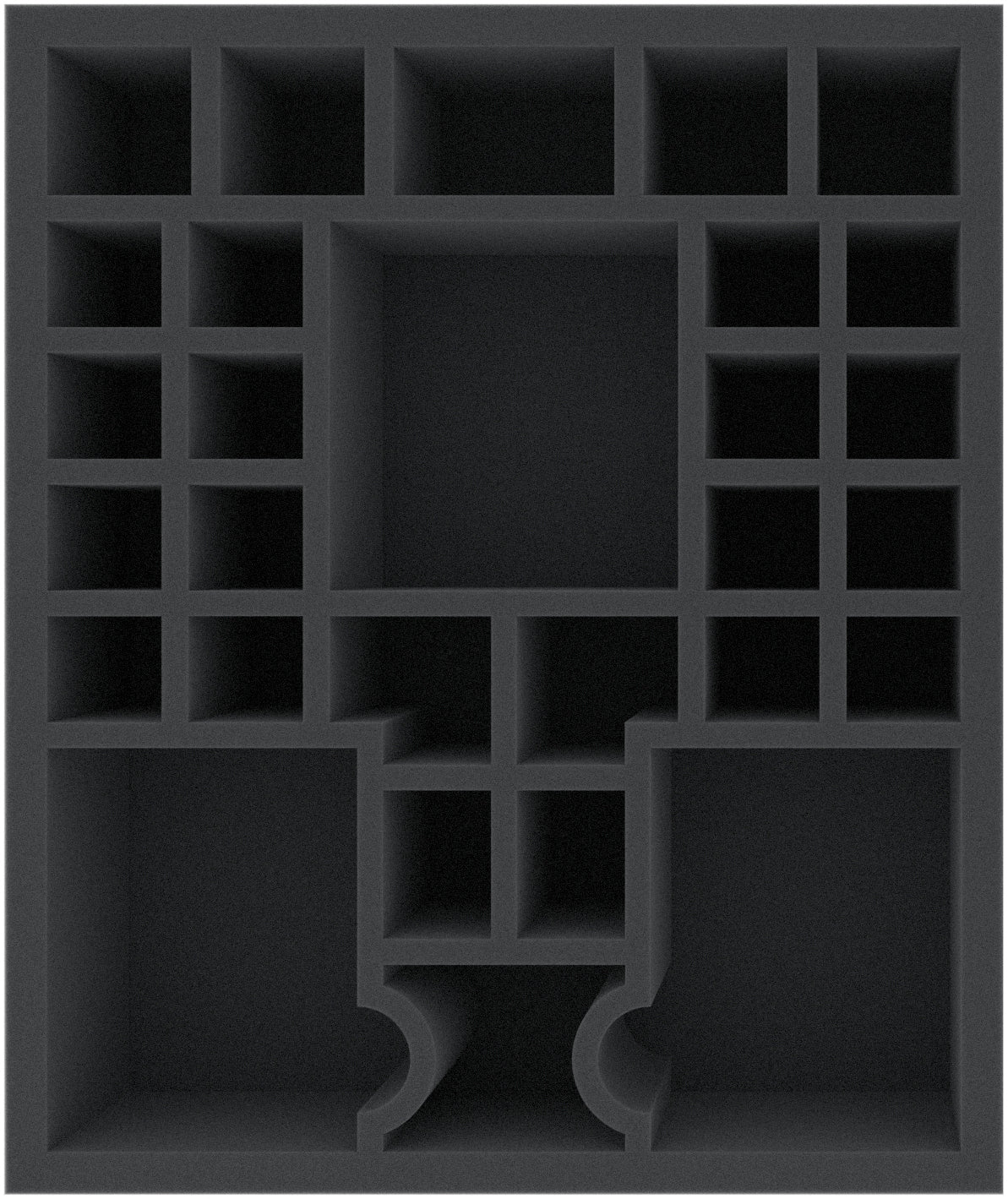 This 70 mm high foam tray is divided into 29 compartments. It is particularly suitable for the safe storage of tabletop and board game miniatures, as well as other fragile models and small parts.