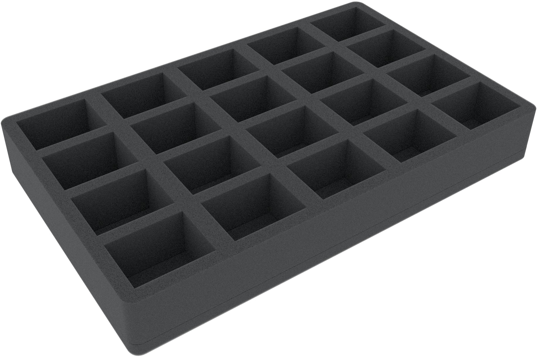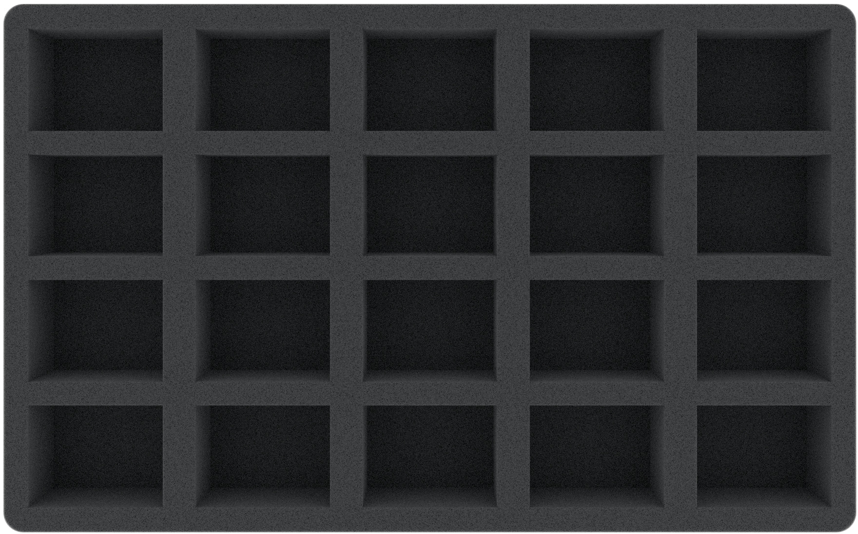 This 45 mm tall foam tray is divided into 20 compartments. It is particularly suitable for the safe storage of up to 20 miniatures on bases up to 35 mm. It doesn’t matter to which game system they belong. The set works reliably with miniatures from GamesWorkshop, Star Wars Legion, or Kingdom Death.