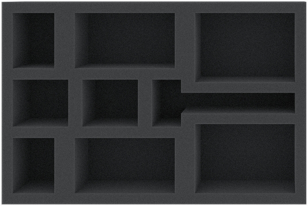 This 50 mm high foam tray is divided into 9 compartments. It is particularly suitable for the safe storage of tabletop and board game miniatures, as well as other fragile models and small parts.