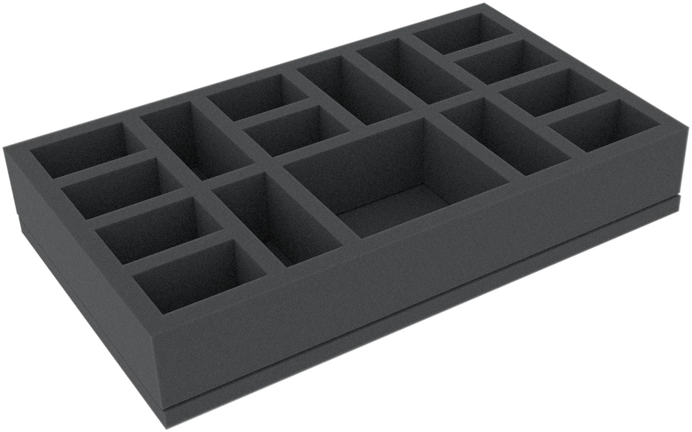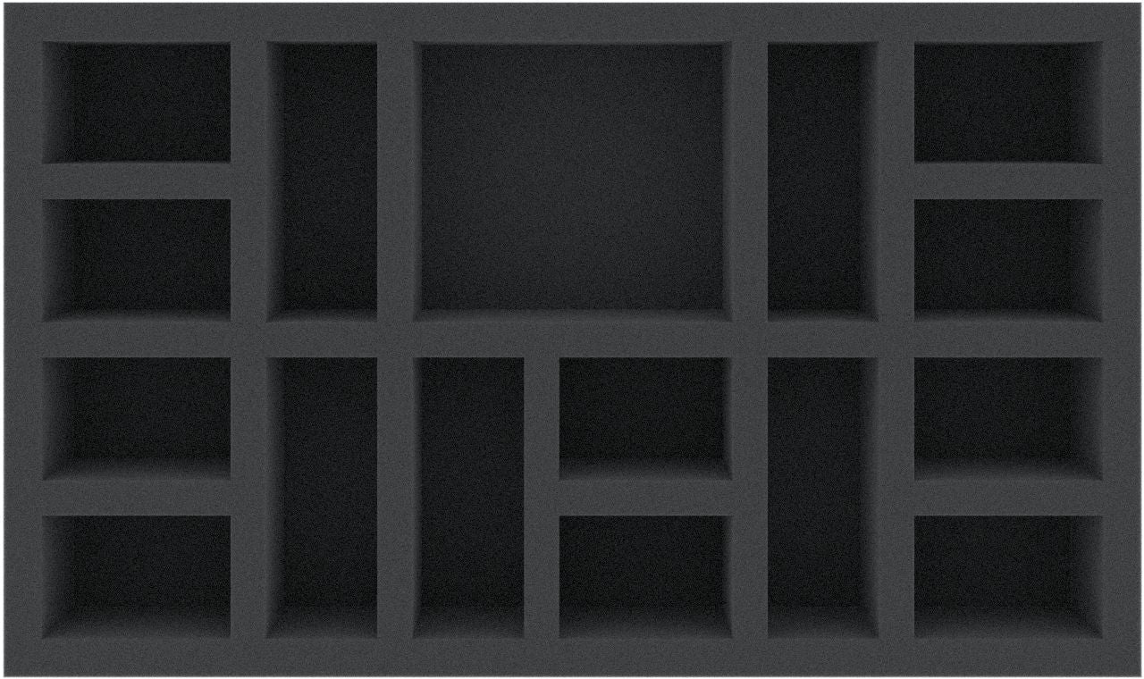 This 50 mm high foam tray is divided into 16 compartments. It is particularly suitable for the safe storage of tabletop and board game miniatures, as well as other fragile models and small parts.