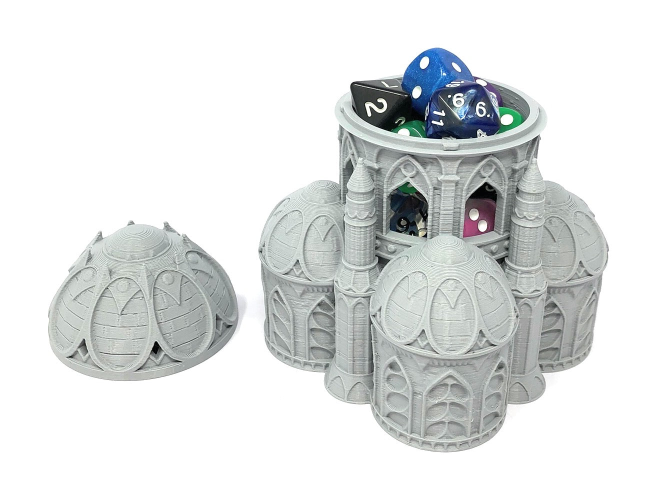 3D printed - detailed dice jail. The Dice Jail can also be used as a terrain part for your miniatures game or as a center piece for your next DnD session.