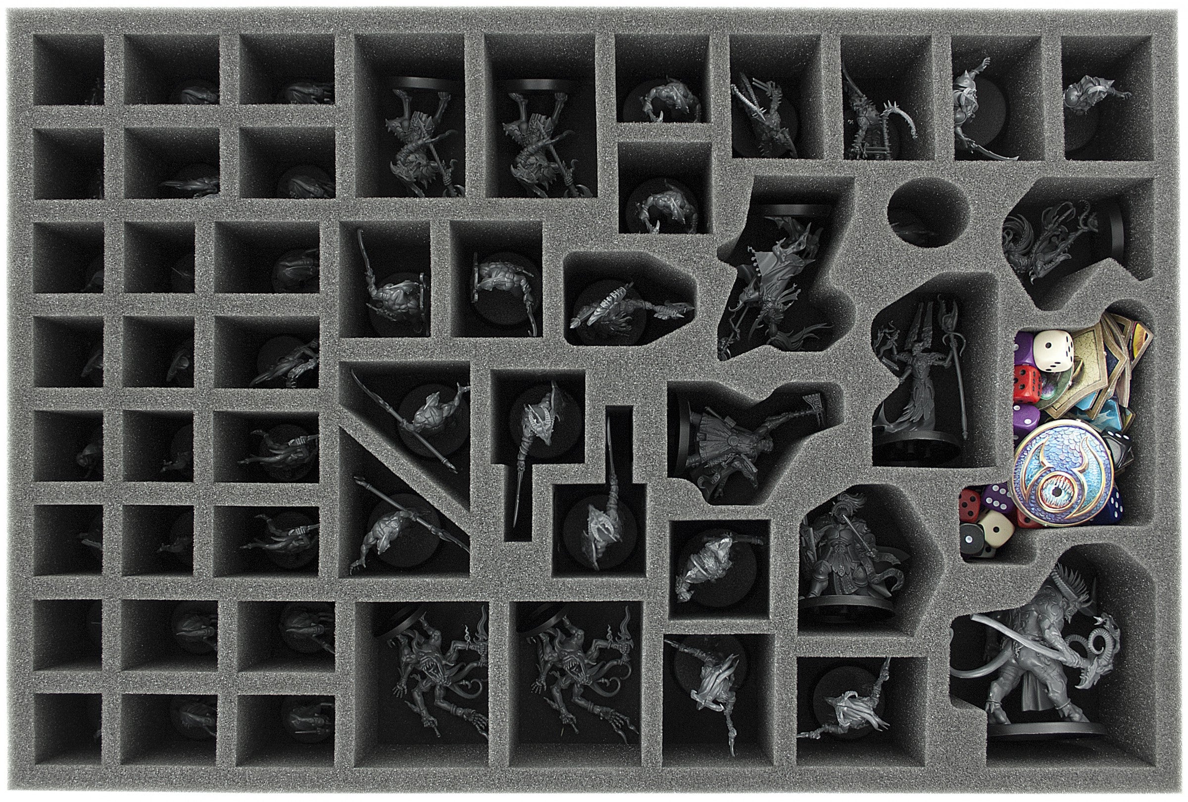 - 1 x 60 mm foam tray for the entire Warhammer Quest - Silver Tower miniatures with 52 compartments (item no. AT01Set)
