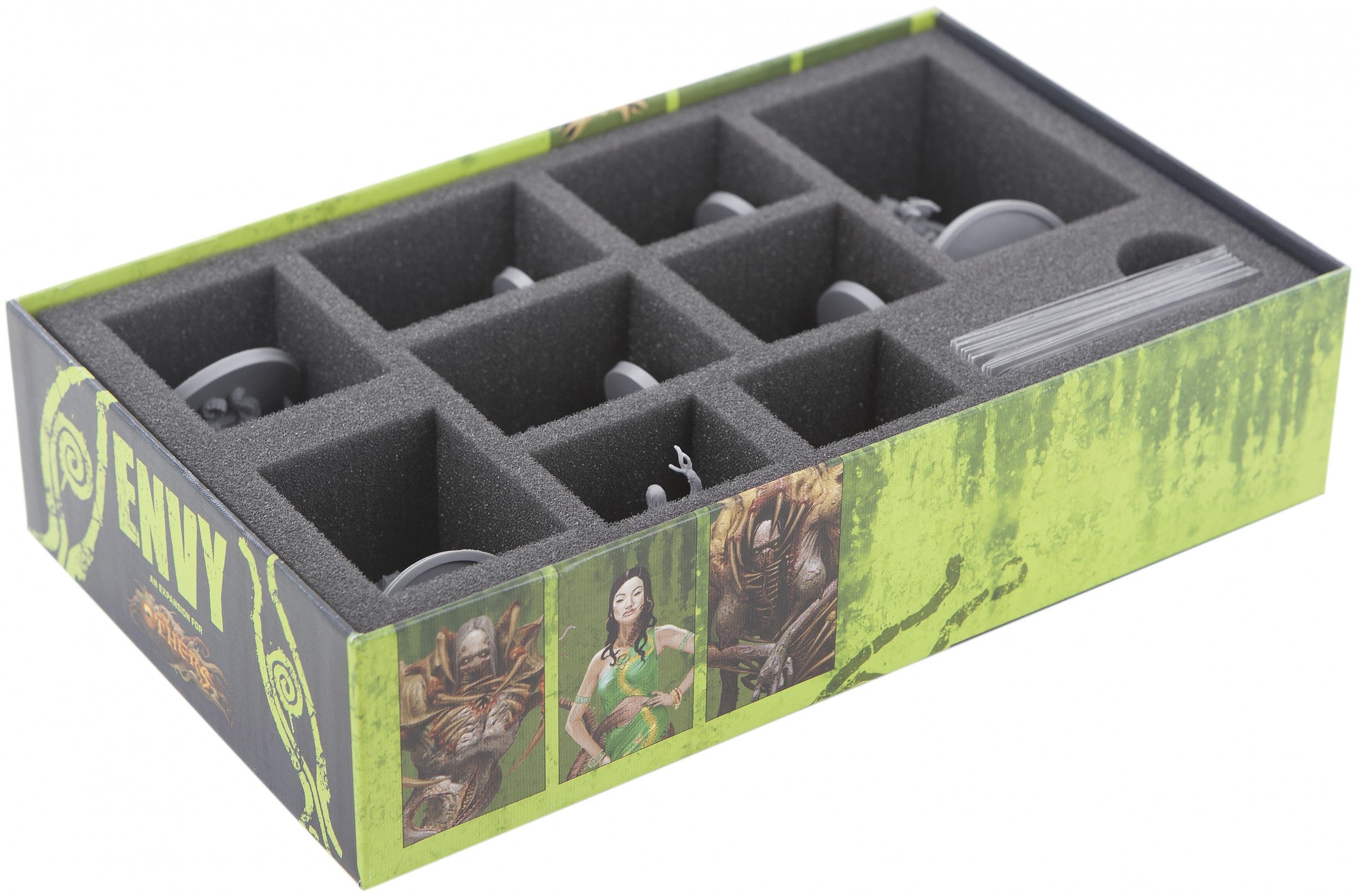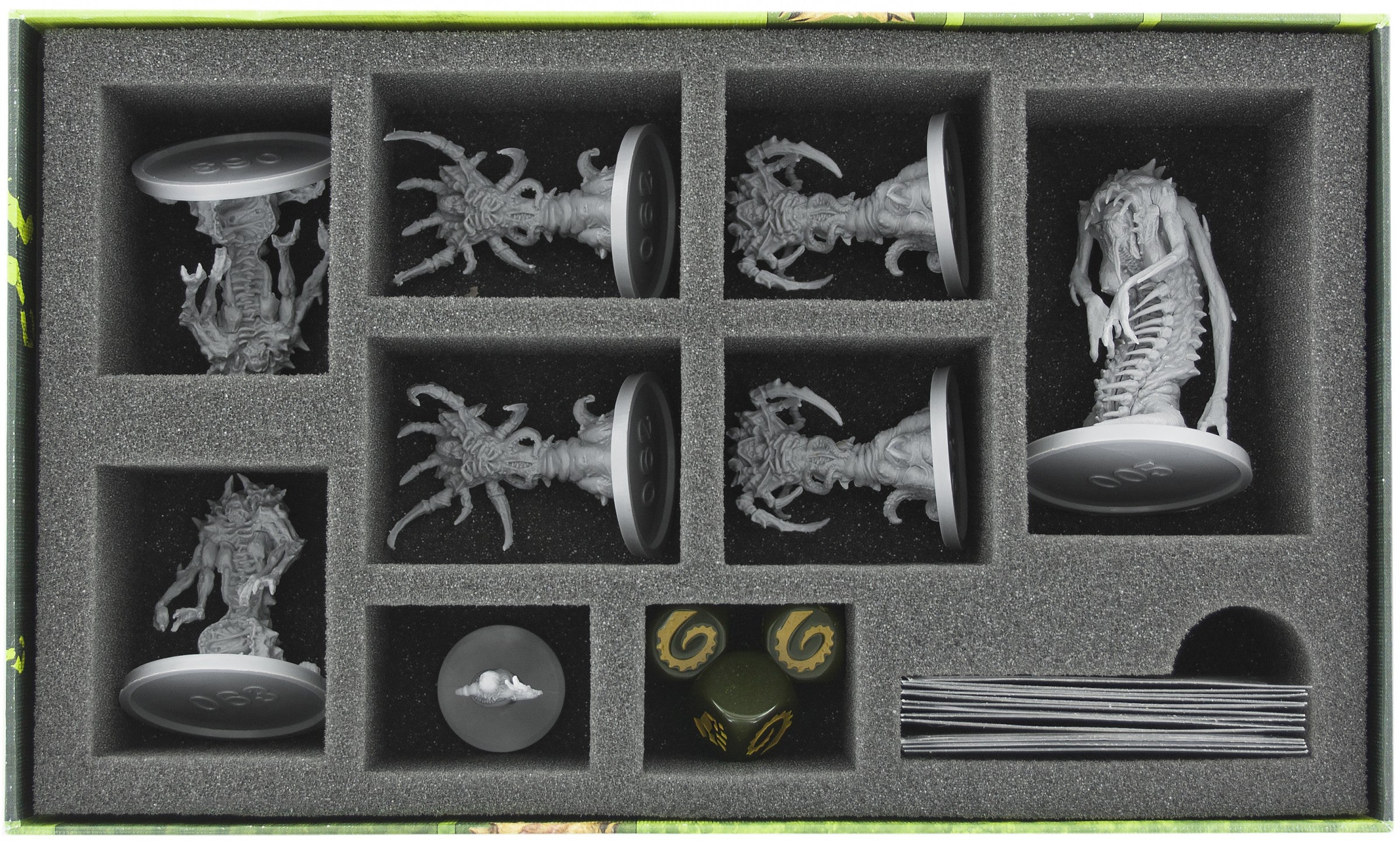 Foam insert for the small Sin box. The insert is 238 mm x 140 mm x 55 mm and comes with a matching topper. There is enough space for 6 Abominations, 1 Avatar and 1 Comtroller, as well as the cards (with or without sleeves) and accessories.