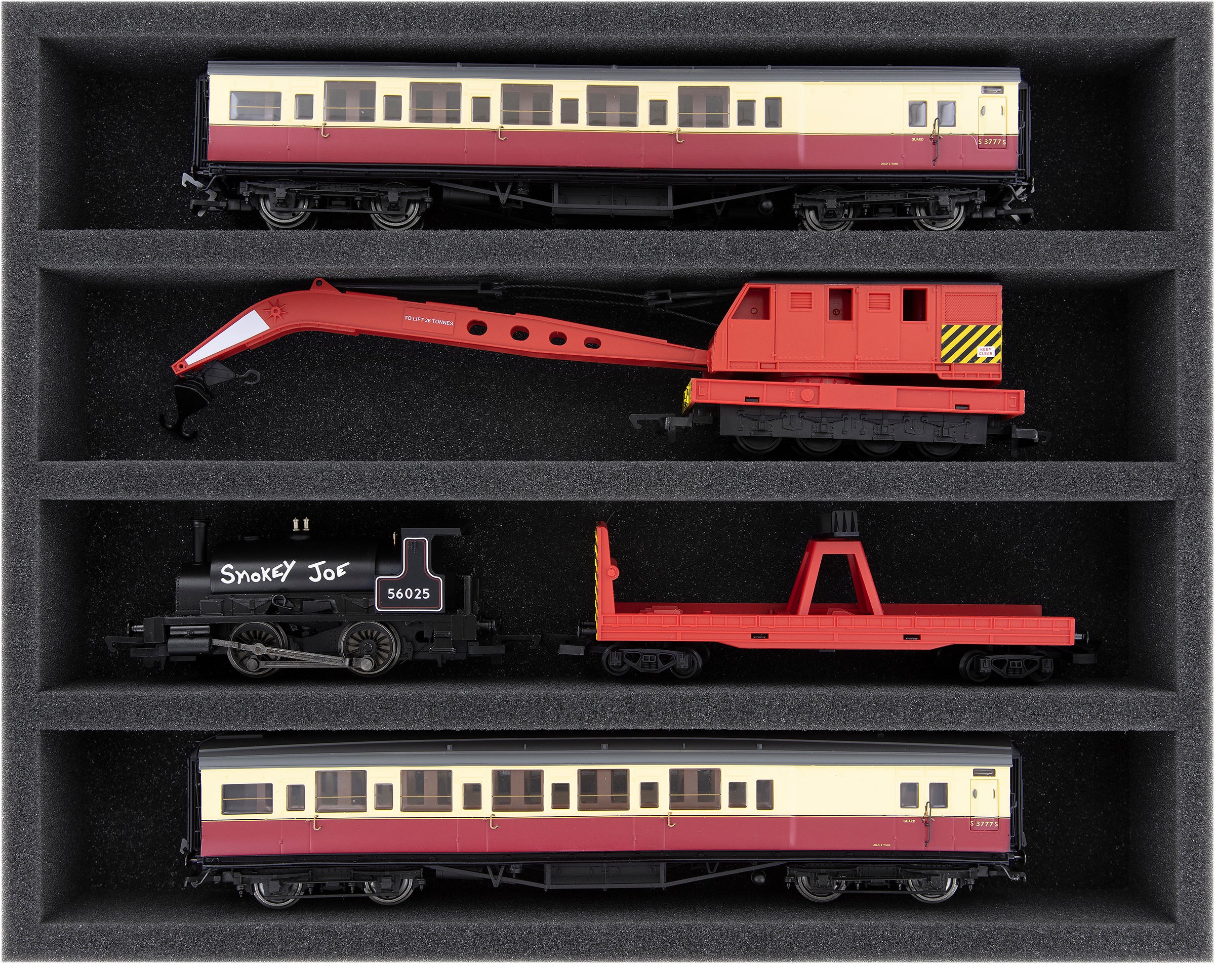 Plusieurs trains et wagons peuvent être rangés les uns à côté des autres dans un même compartiment. Afin d'éviter toute collision ou accouplement involontaire, nous proposons des entretoises en mousse adaptées (HS040A002, HS020A001) pour séparer vos véhicules.