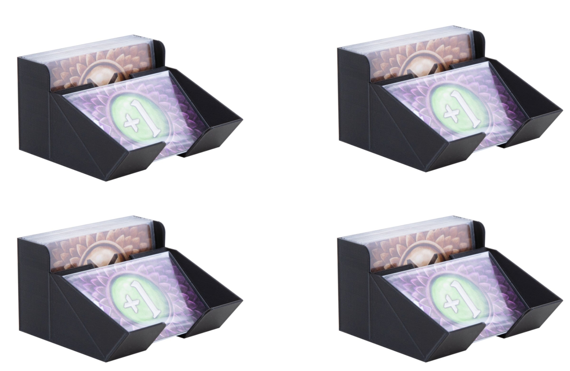 - Chaque support de jeu comporte 2 compartiments. Le jeu de cartes se trouve dans le compartiment arrière, et la pile de défausse dans le compartiment avant. Vous pouvez donc tirer des cartes et les placer directement dans le compartiment avant.