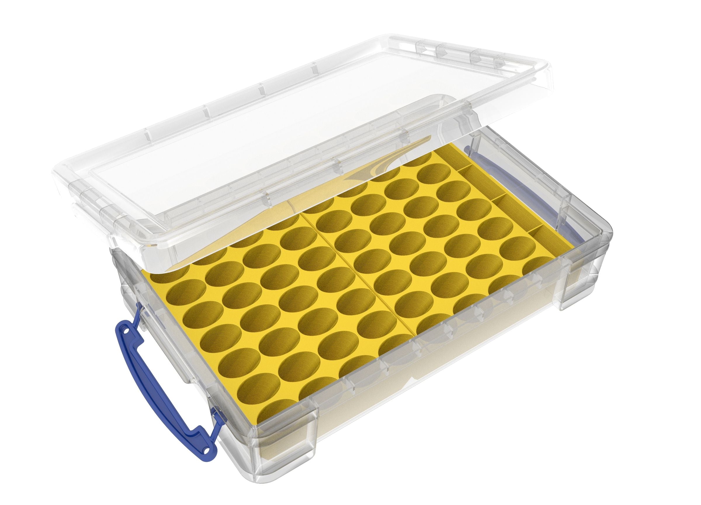 La solide boîte de 4L Really Useful Box offre une protection fiable et peut être stockée de manière peu encombrante. Empilez-les sur l'étagère ou mettez-les dans votre sac à dos. Même à l'envers, les couleurs restent dans leur compartiments et bénéficient d'une protection optimale.