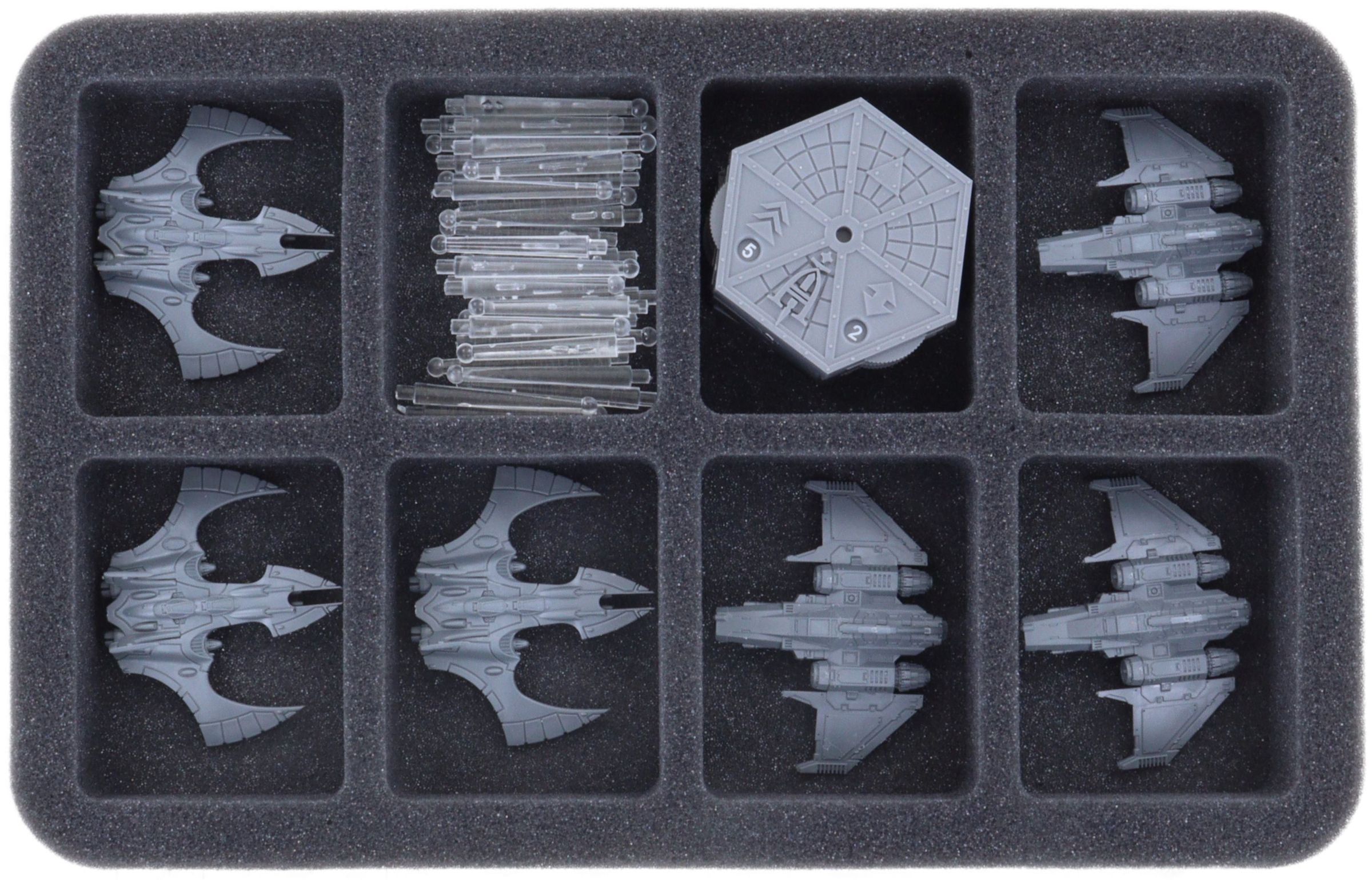 Le mousses de rangement possède 8 compartiments de taille égale pour un stockage sûr et ordonné des Nightwing Interceptors, Phoenix Bombers et autres modèles de taille similaire.