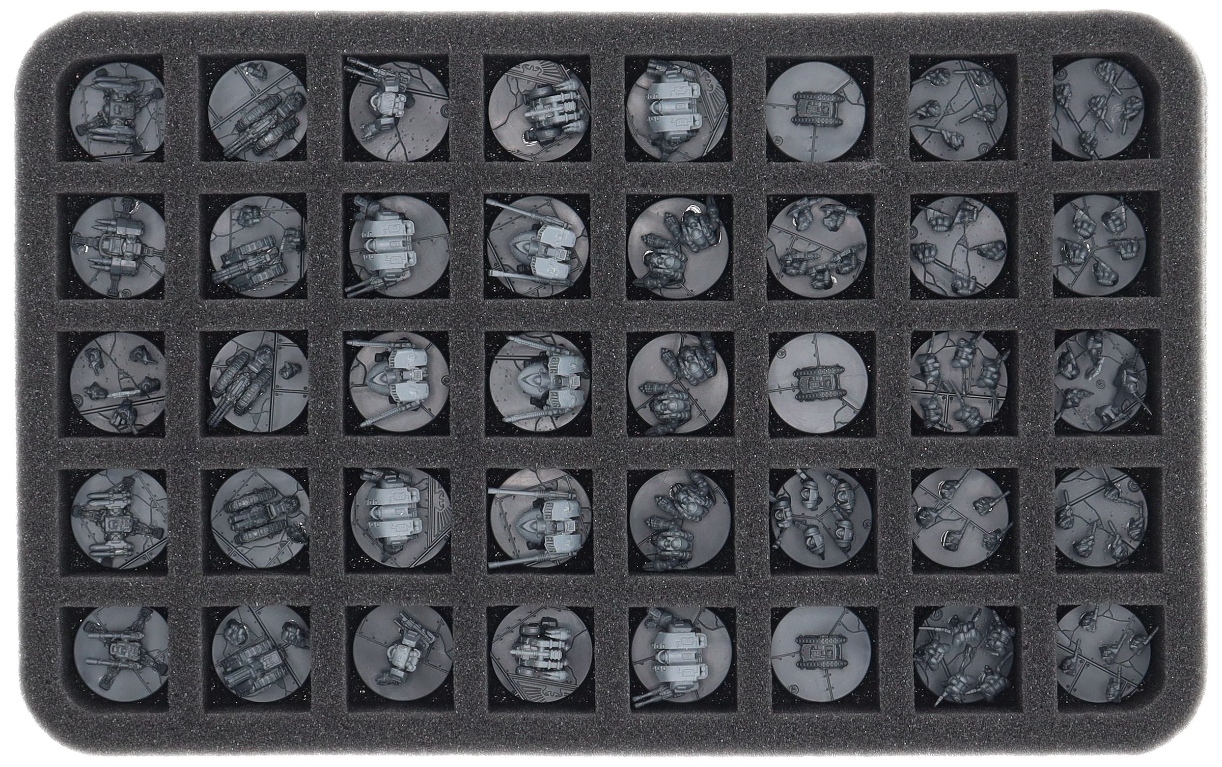 • 1 Half-Size mousses de rangements avec 40 compartiments pour les modèles d'infanterie tels que Space Marines, Leviathan Dreadnoughts, Legion Rapier, Legion Tarantula, Auxilia Rapier, Auxilia Tarantula, Solar Auxilia Cyclops et les modèles de dimensions similaires. (HS035A071)