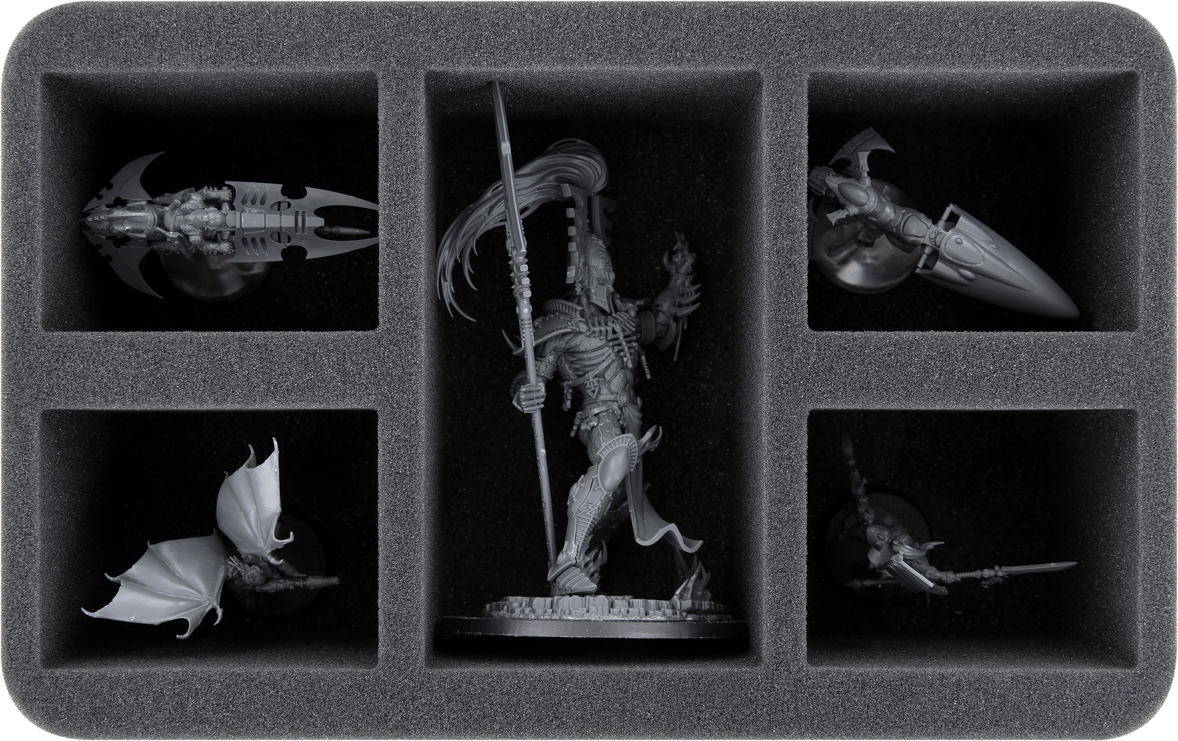 Sur cette Feldherr mousses de rangement vous avez de la place pour jusqu'à 5 figurines de votre armée Aeldari. Le grand compartiment est particulièrement adapté à l'Avatar de Khaine. Les 4 autres compartiments peuvent être utilisés pour stocker de l'infanterie ou des figurines de dimensions similaires.
