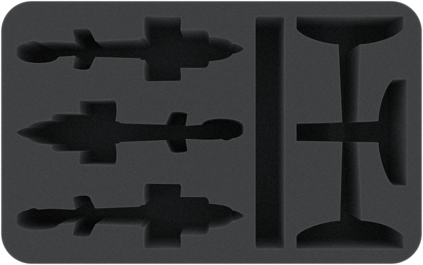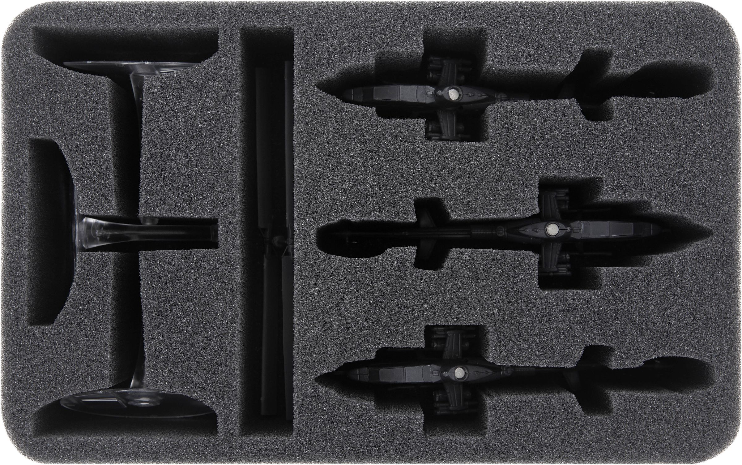 Trois compartiments découpés sur mesure offrent de l'espace pour les coques des hélicoptères. La mousse à pores fins offre une protection optimale contre les dommages - les pièces délicates comme les ventilateurs de gouvernail et les armes restent intactes, la couleur des modèles peints reste intacte.