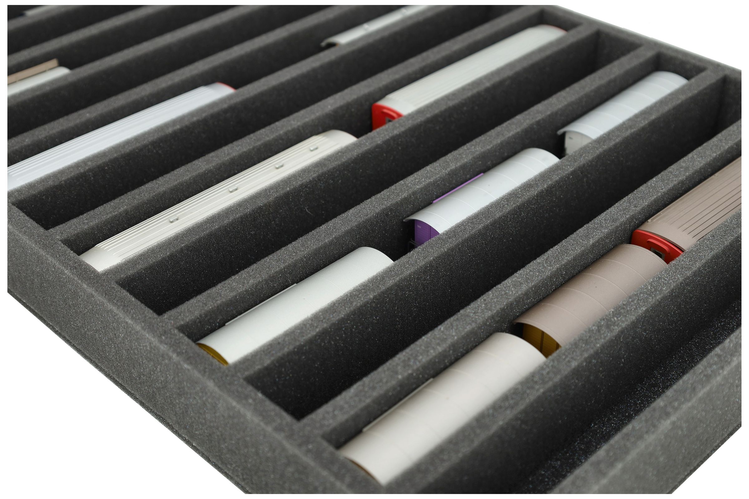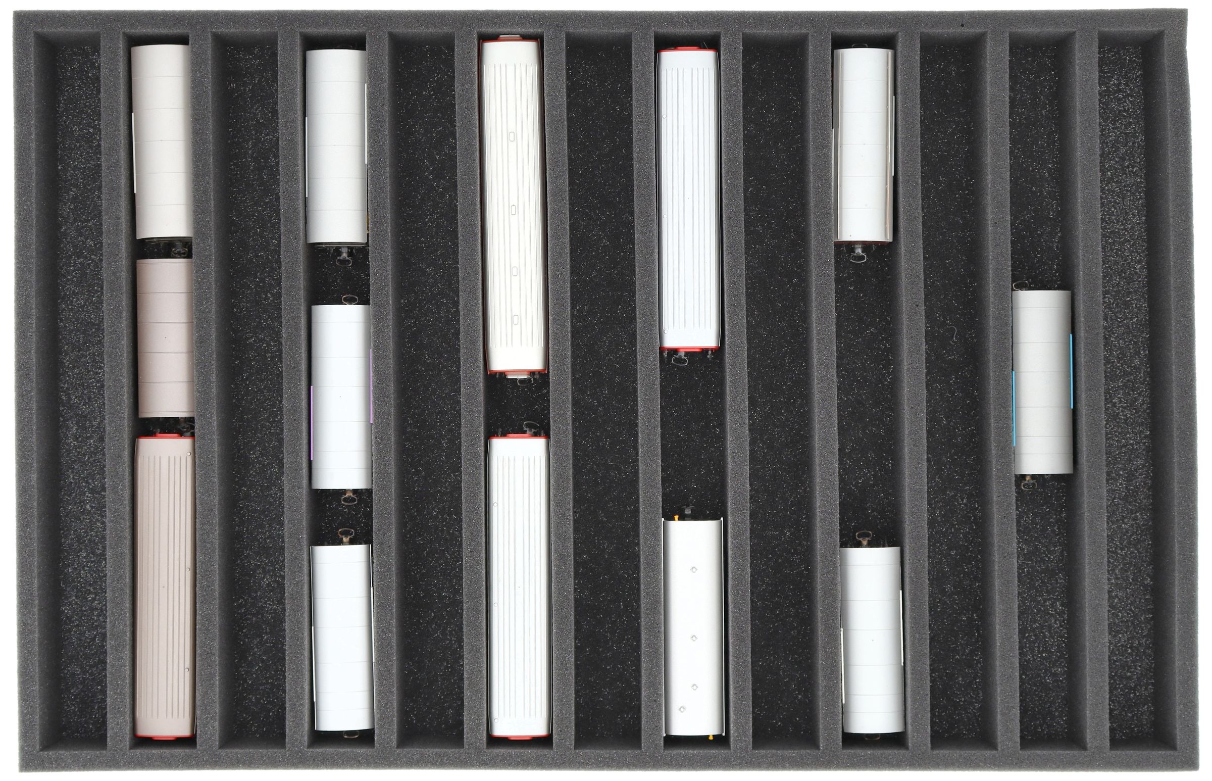 Whether for transport to exhibitions, module meetings, or safe storage on shelves at home, this insert keeps your H0m scale locomotives and cars reliably protected. The 13 compartments hold the models upright and shield them from bumps and scratches.